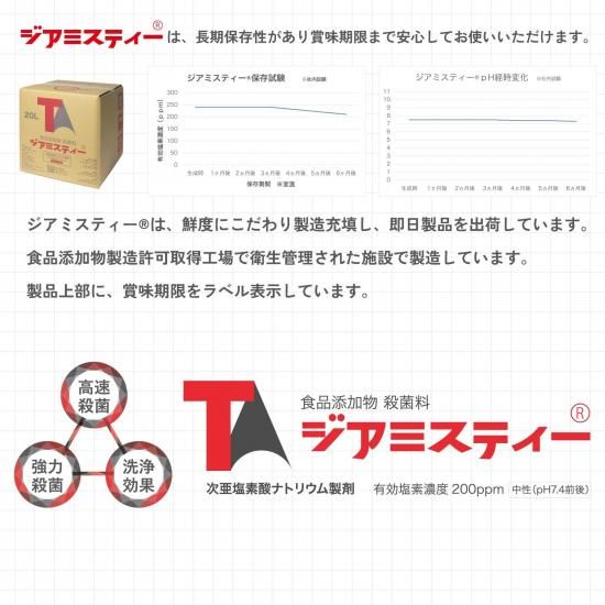 「ジアミスティー®」は業界初、次亜塩素酸ナトリウム製剤の「中性・食品添加物殺菌料」です。
